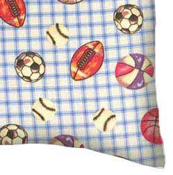 • Twin pillow case. Made of an all cotton flannel fabric. Side Opening. Features a sports print of baseball, football, basketball, soccer ball, voleyball and more on blue and white grid background.